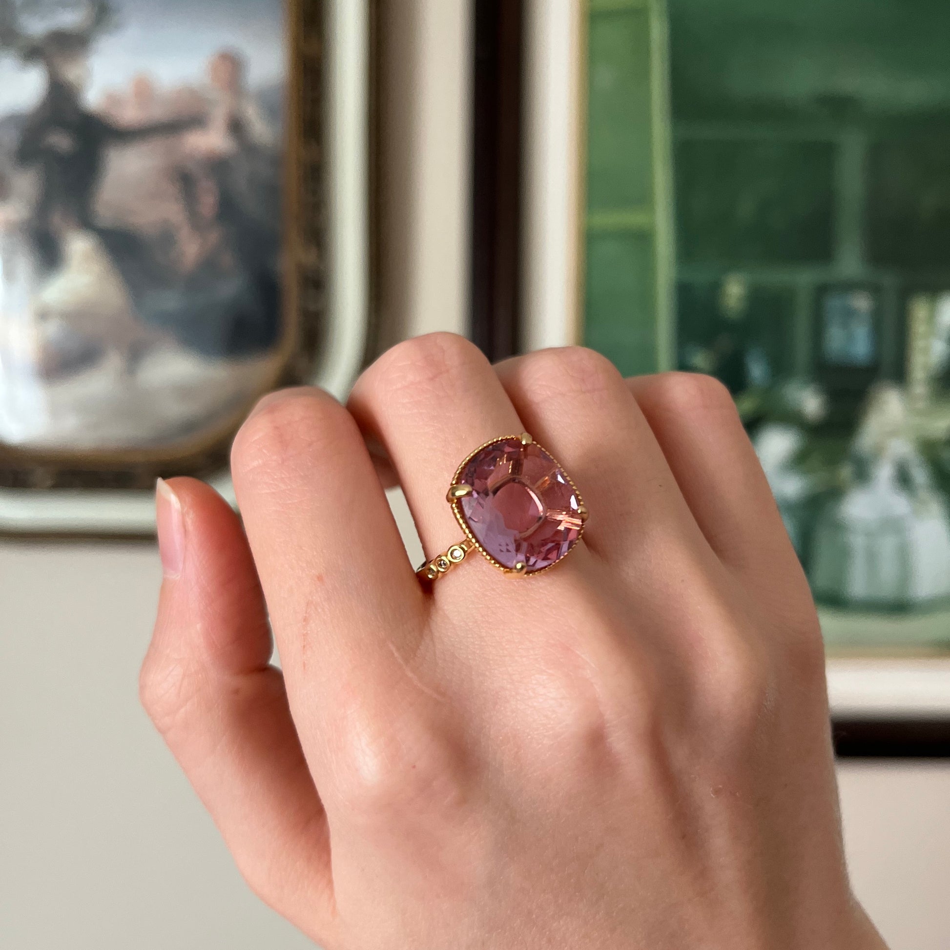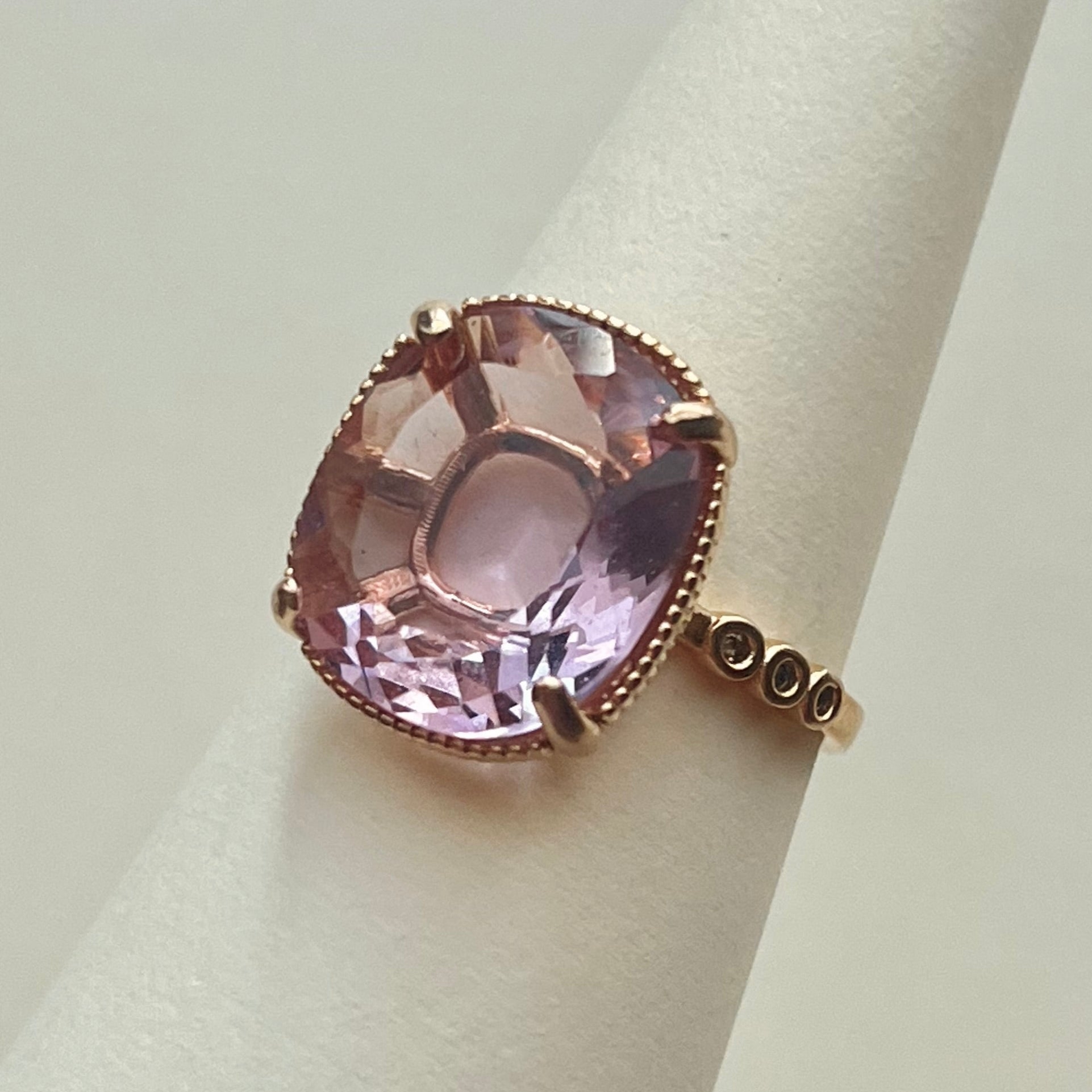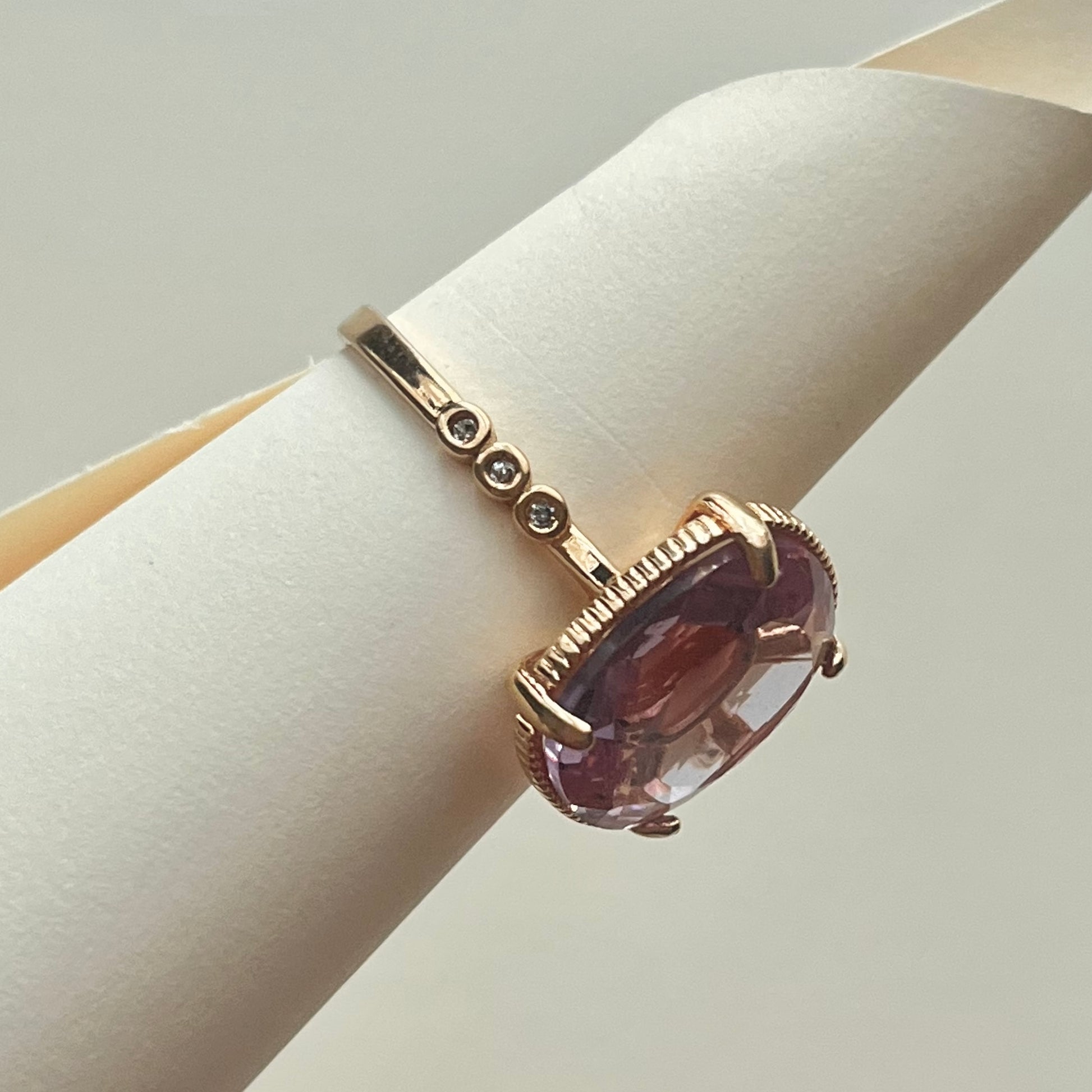 anel com banho de ouro 10 microns com grande pedra zircônio rosado ao centro. possui 3 pequenas pedras transparentes em cada lado. todas as pedras são sintéticas. em excelente estado de conservação, sem avarias.