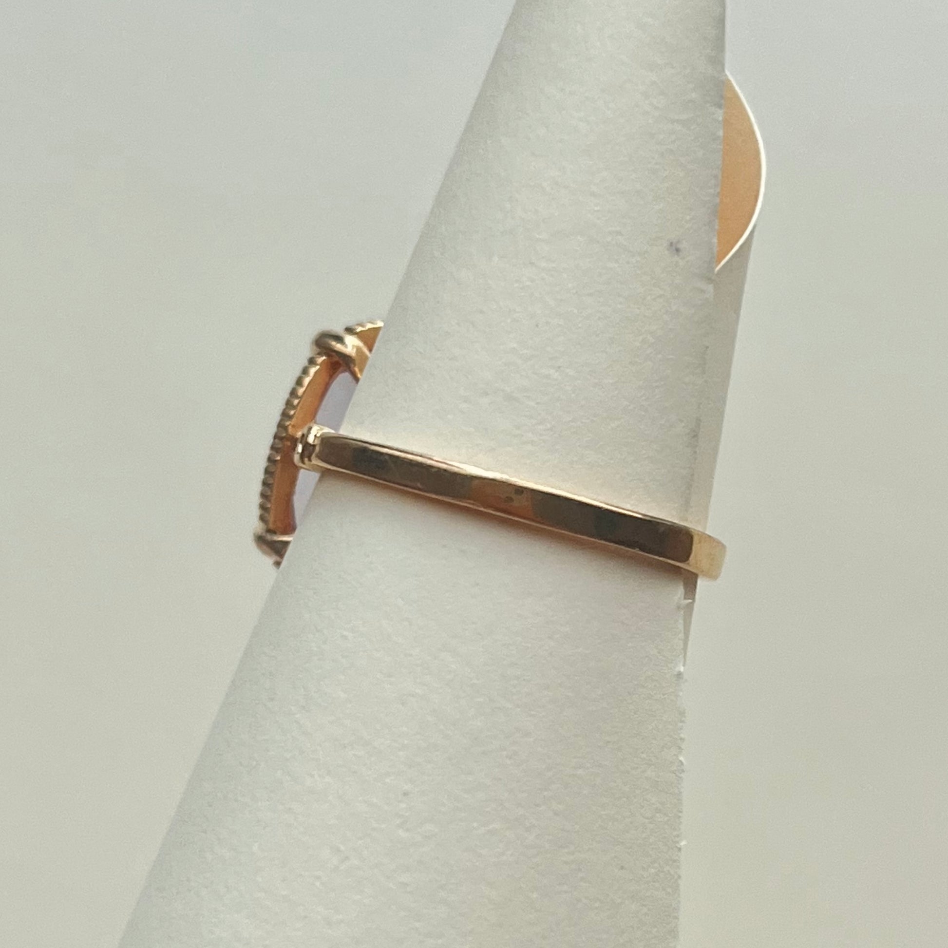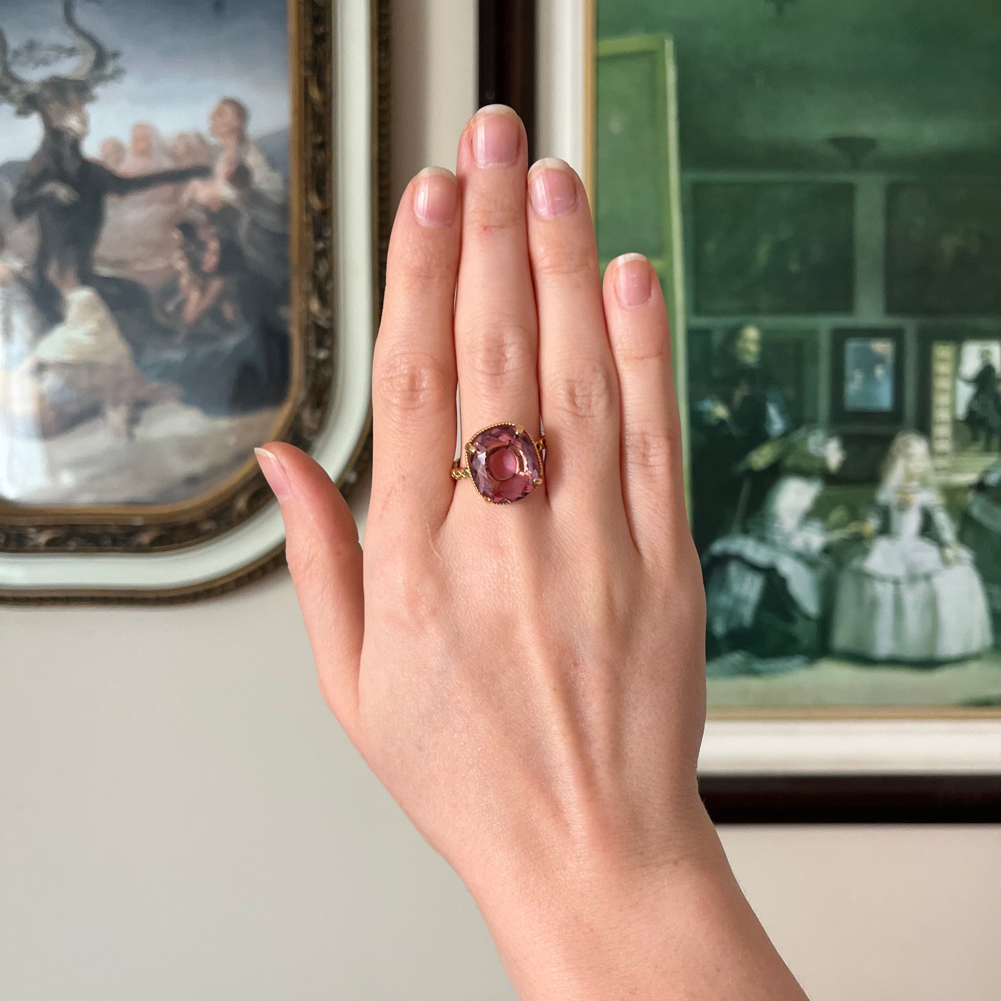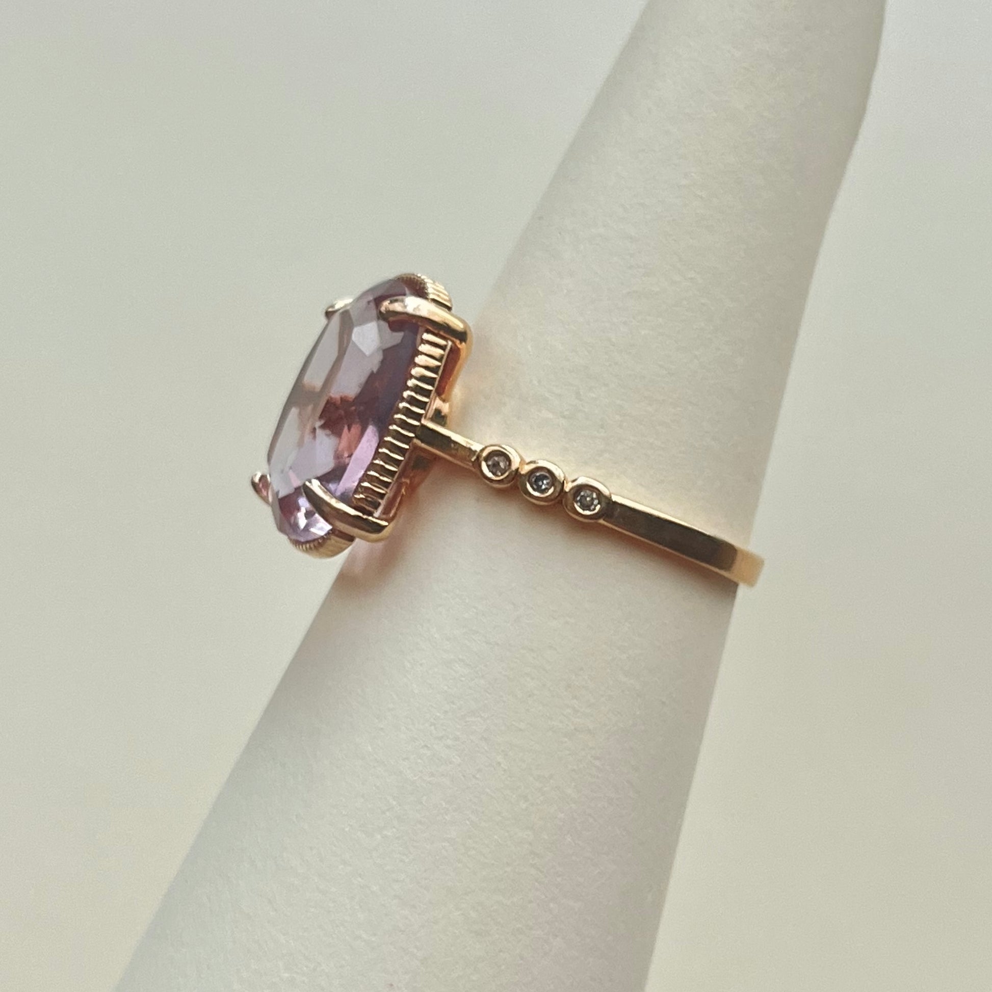 anel com banho de ouro 10 microns com grande pedra zircônio rosado ao centro. possui 3 pequenas pedras transparentes em cada lado. todas as pedras são sintéticas. em excelente estado de conservação, sem avarias.