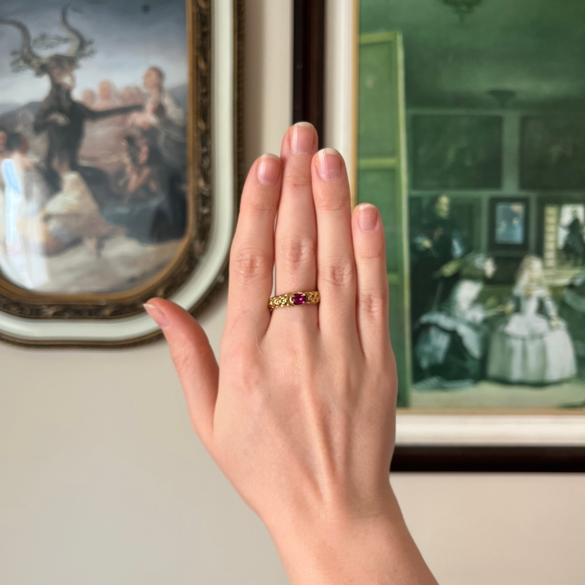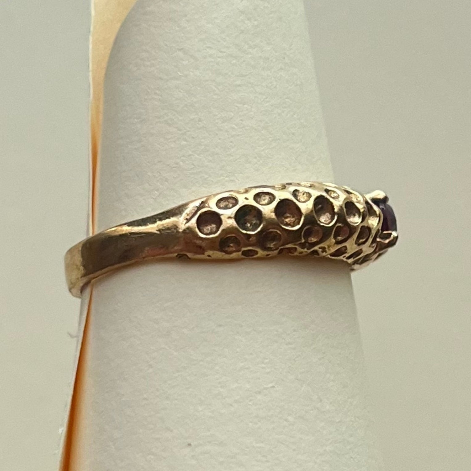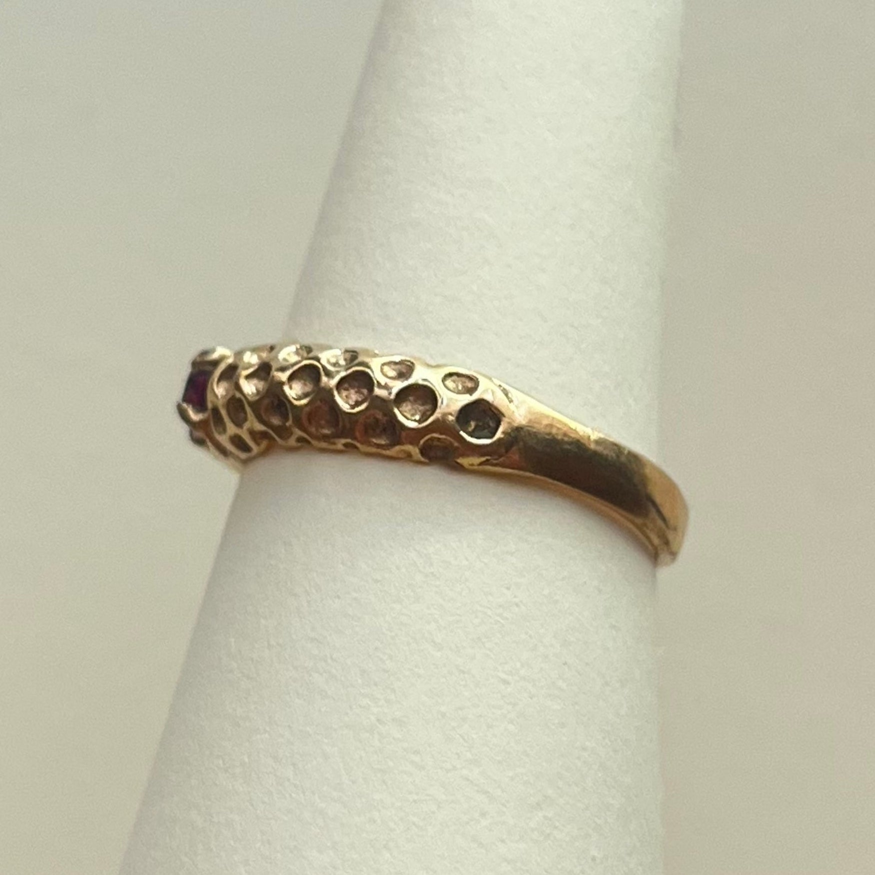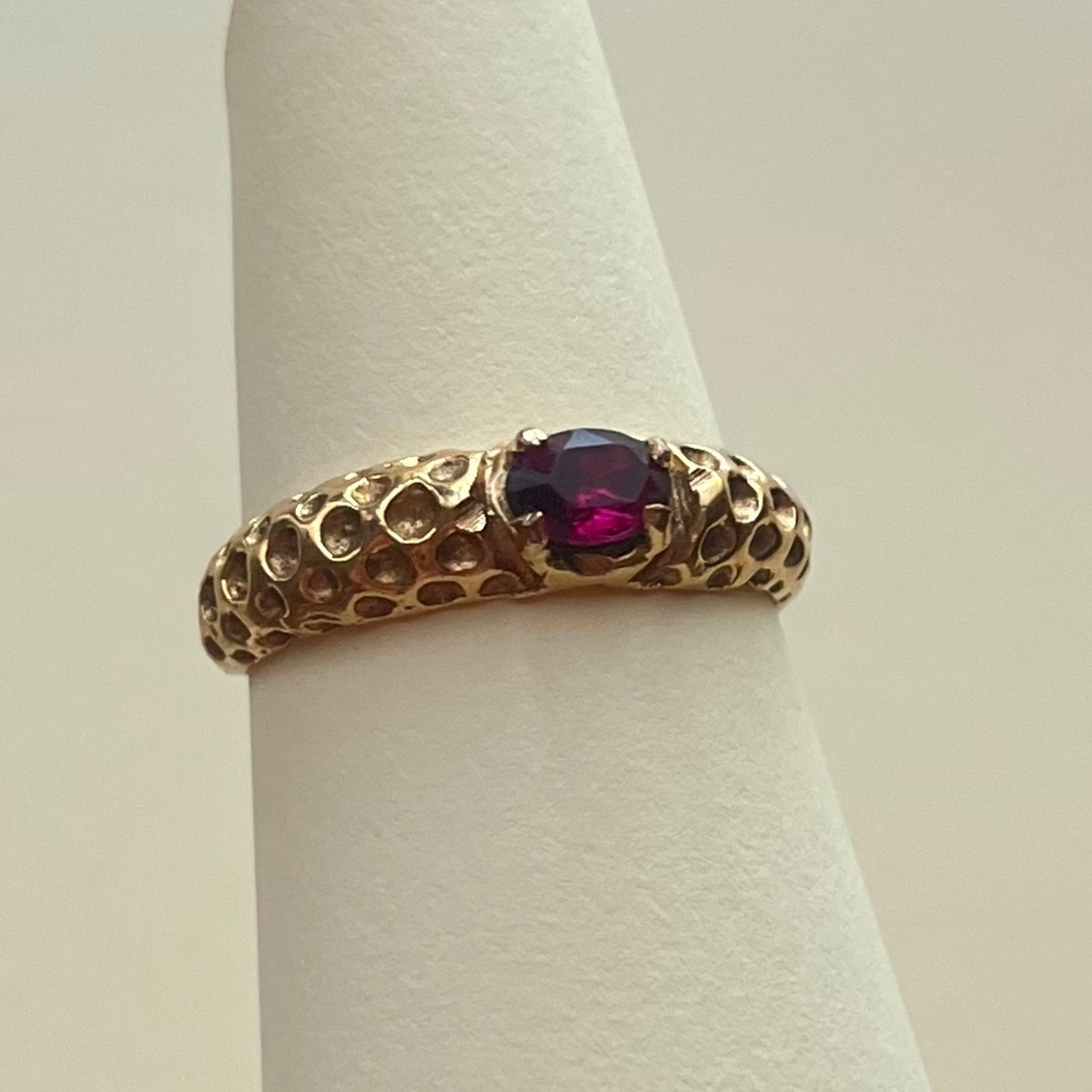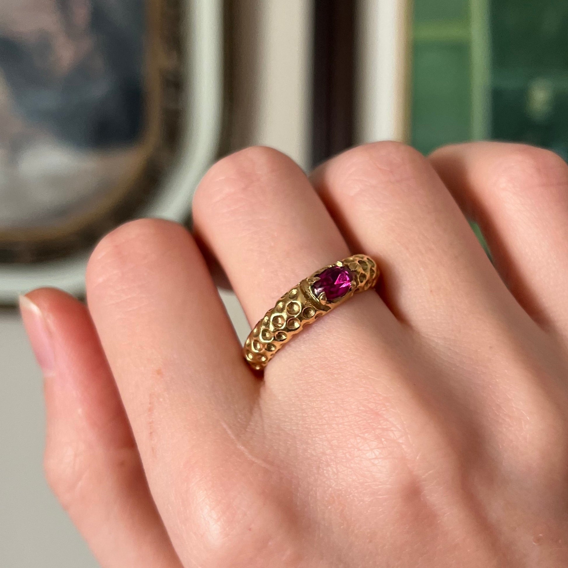 anel vintage com banho de ouro 10 microns. possui trabalho texturizado e pequena pedra turmalina rosa ao centro. sem avarias.