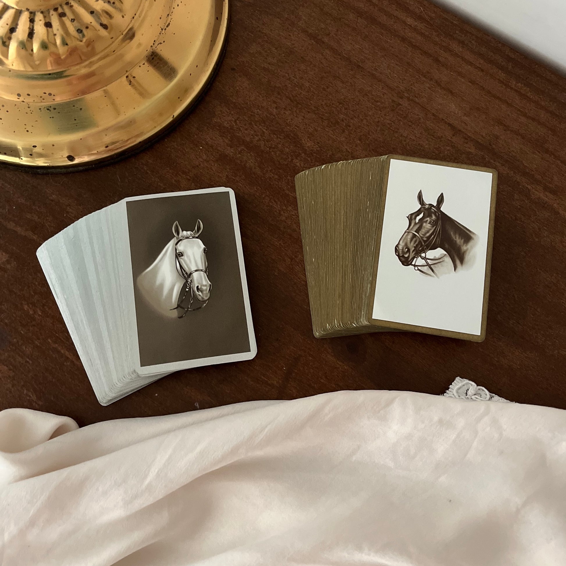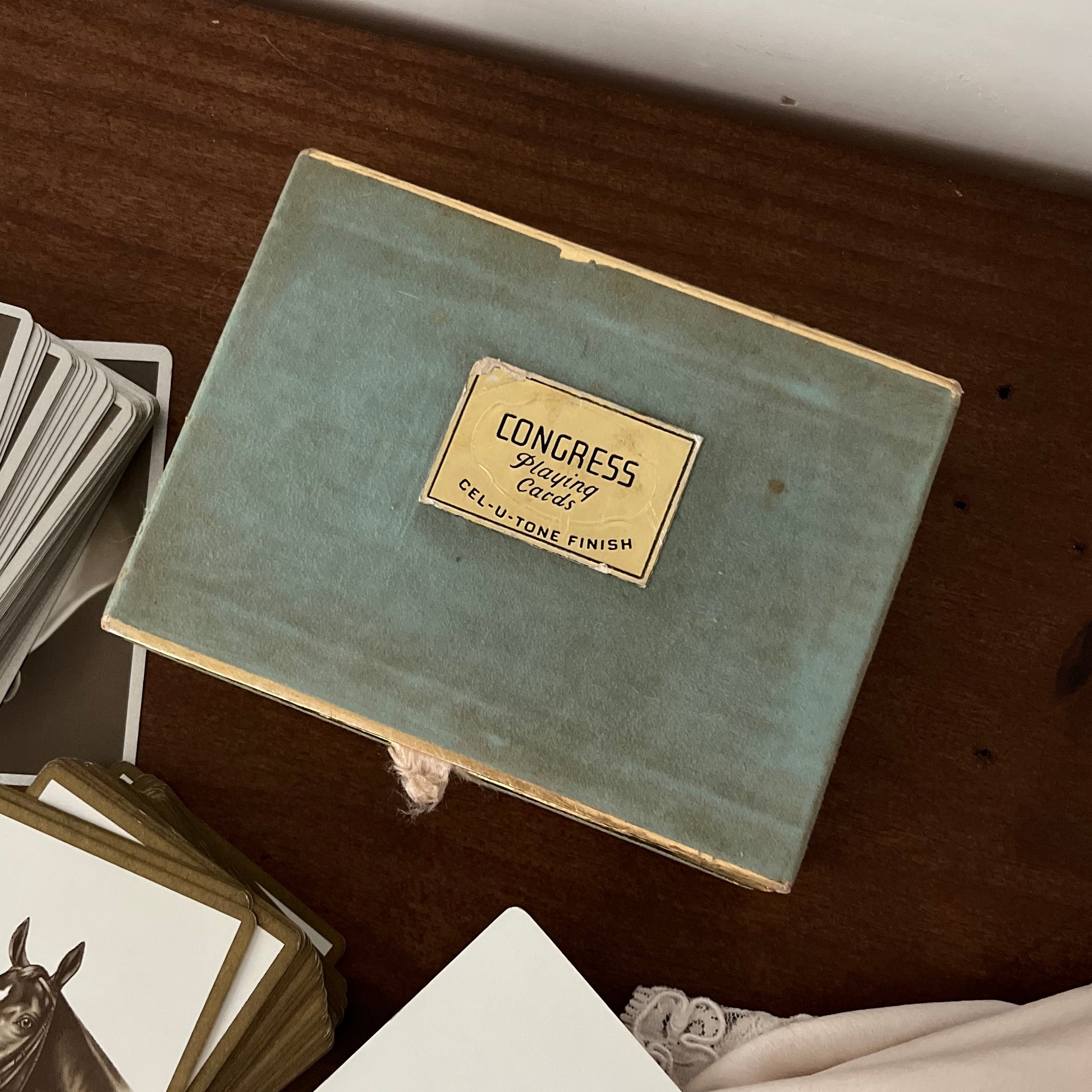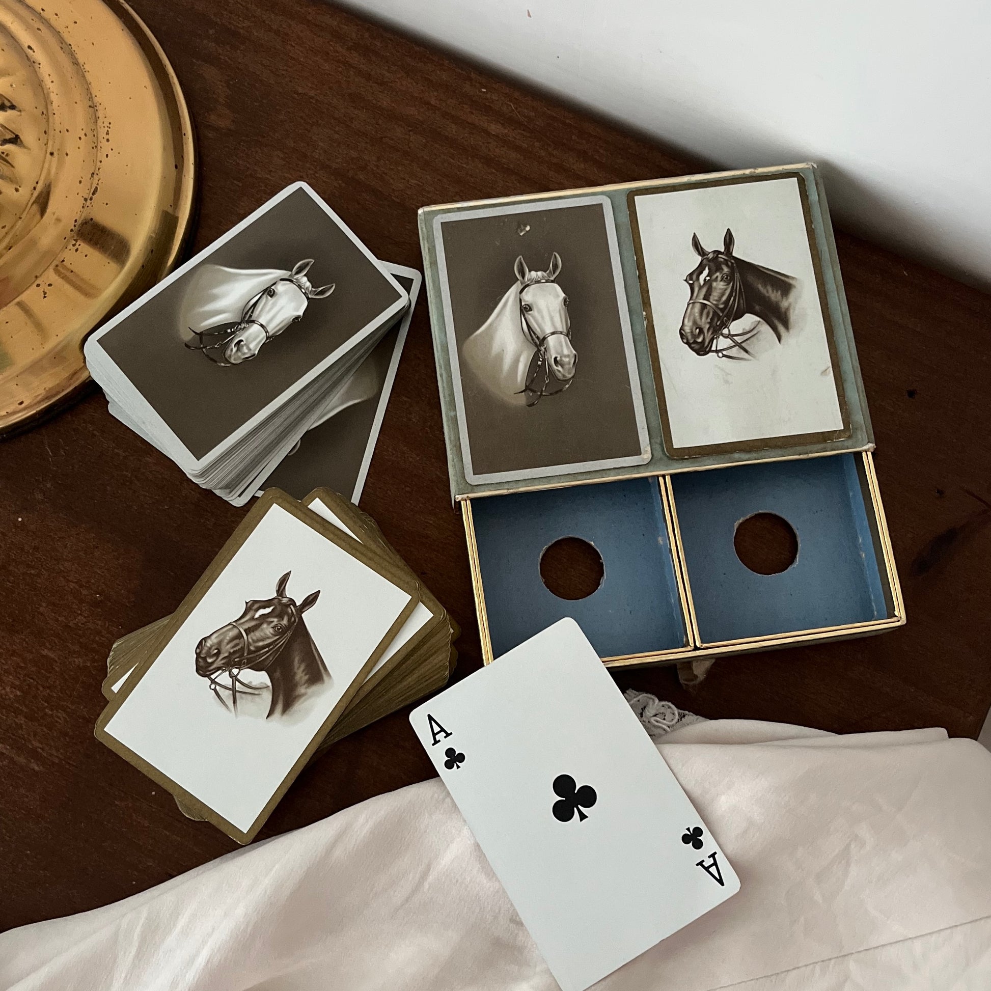 jogo de cartas vintage da marca Congress, feito no EUA. dois jogos completos com 52 cartas cada, mais dois coringas. verso das cartas com ilustrações de cavalos. caixa feita à mão em cartão aveludado e papel dourado.