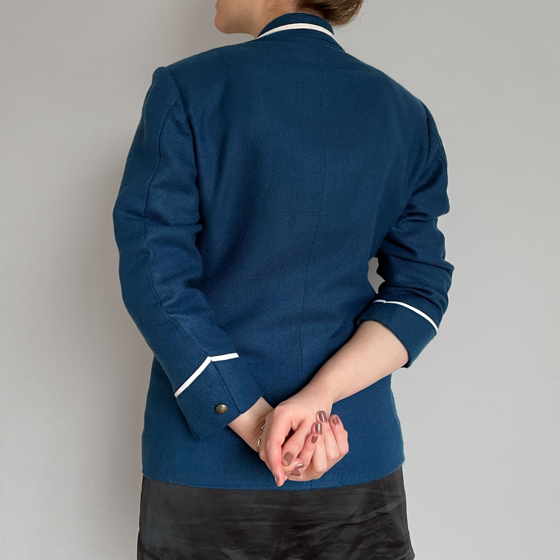 blazer vintage feminino. forrado, com detalhes na lapela, contorno e mangas. sem etiqueta de composição mas aparenta ser blend de lã e viscose