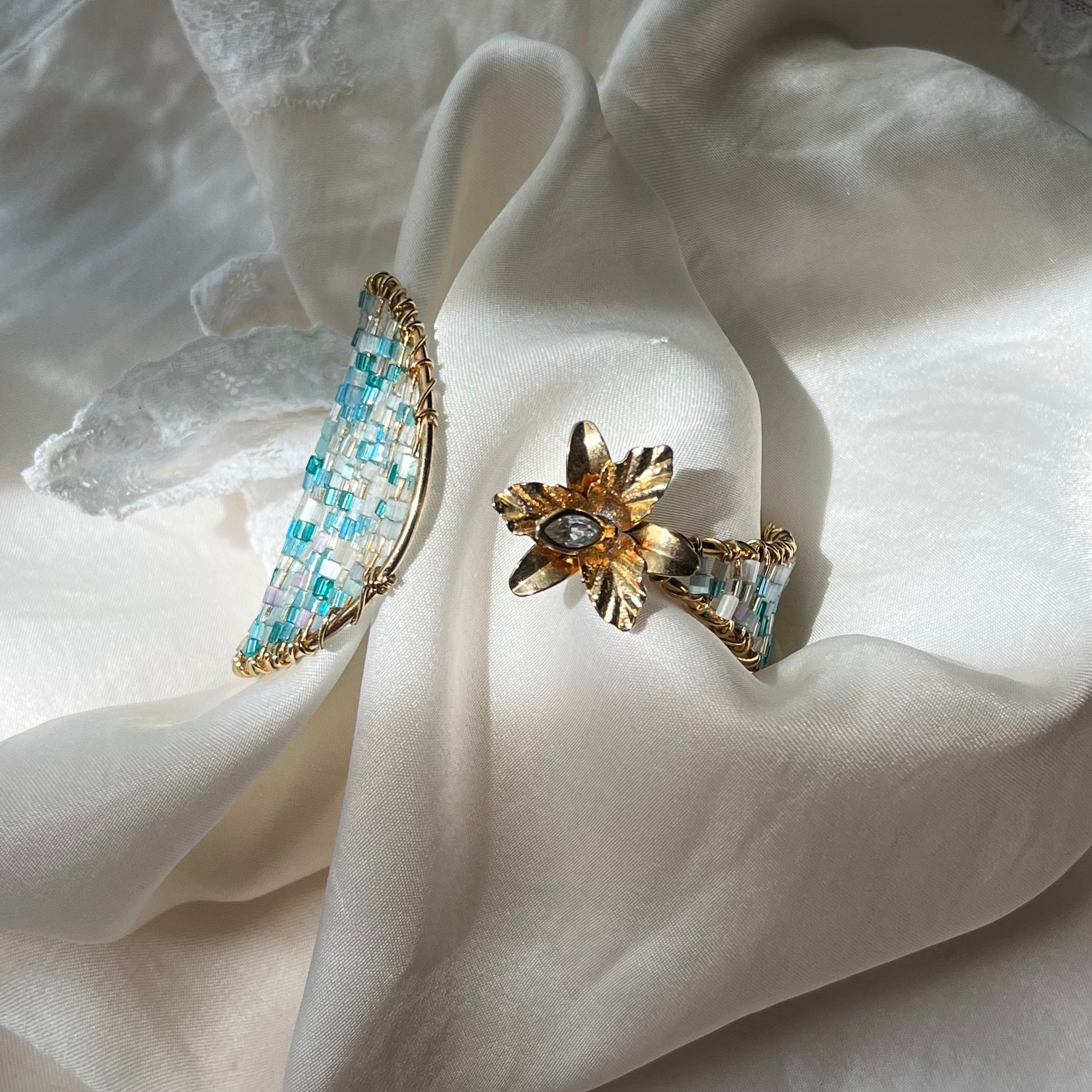 bracelete feito em metal dourado e miçangas azuis. possui acabamento em flor, também em metal dourado, com uma pedrinha azul sintética ao centro. peça muito delicada, aparenta ter sido feita manualmente. em excelente estado de conservação.