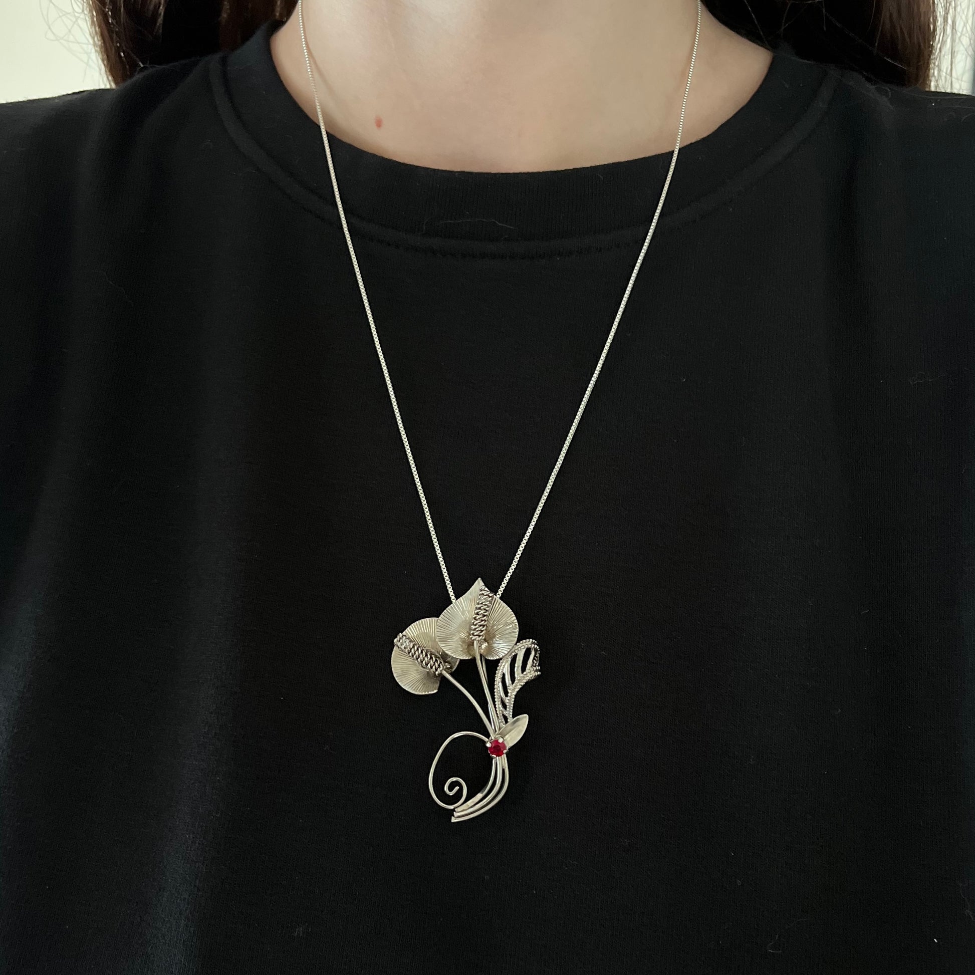 broche vintage feito em metal prateado com pequena pedra sintética vermelha. em ótimo estado de conservação, sem avarias. pode ser usado como colar.