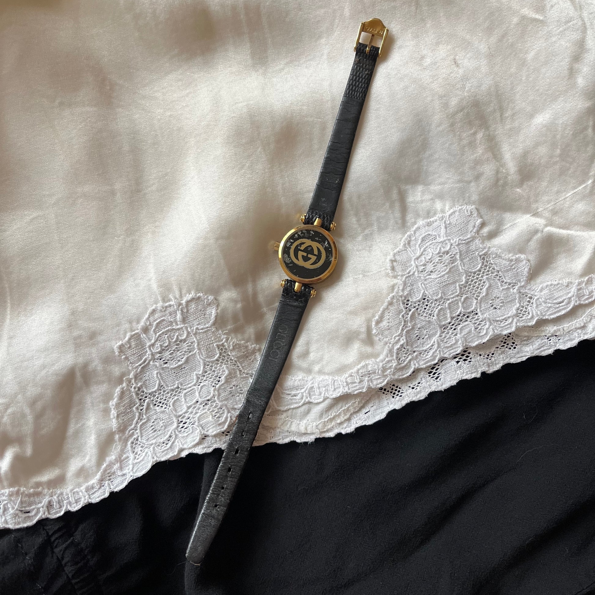 relógio Gucci vintage, funcionando à bateria. maquinário suíço, pulseira original em couro, visor em cristal de safira resistente à riscos e quebra. apresenta pequenas marquinhas na tampa traseira, vide fotos. acompanha estojo original. em geral, excelente estado de conservação.