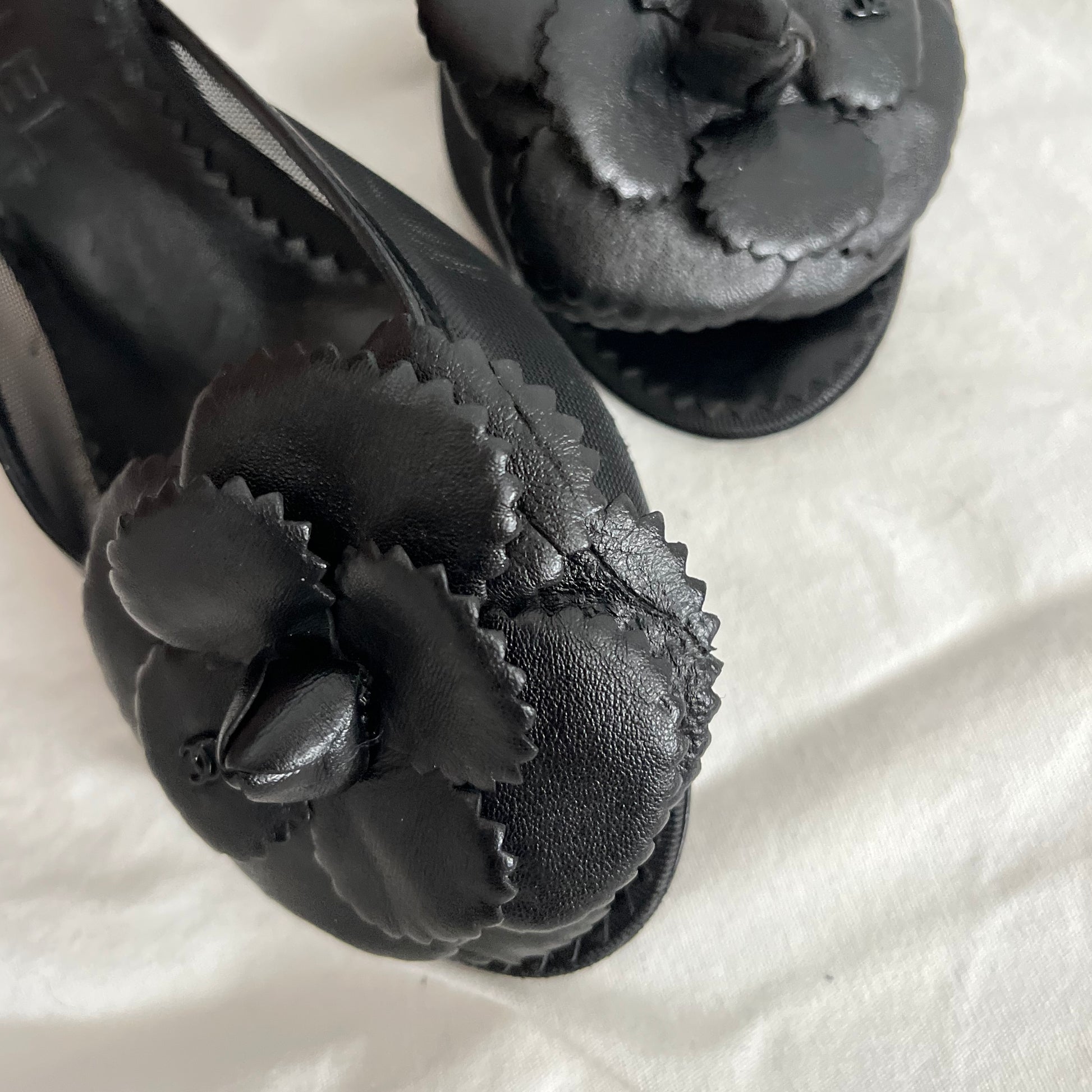 salto kitten heel Chanel, da coleção Fall de 2006. feito na Itália, em couro legítimo. aplicação da icônica Camélia na parte frontal. apresenta pequenos sinais de uso: pequena marca na parte de trás do salto, leves sinais naturais do uso na sola, uma marca em uma das pétalas da Camélia no par direito, vide fotos. em geral em ótimo estado de conservação, peça rara que tende a valorizar com o tempo.