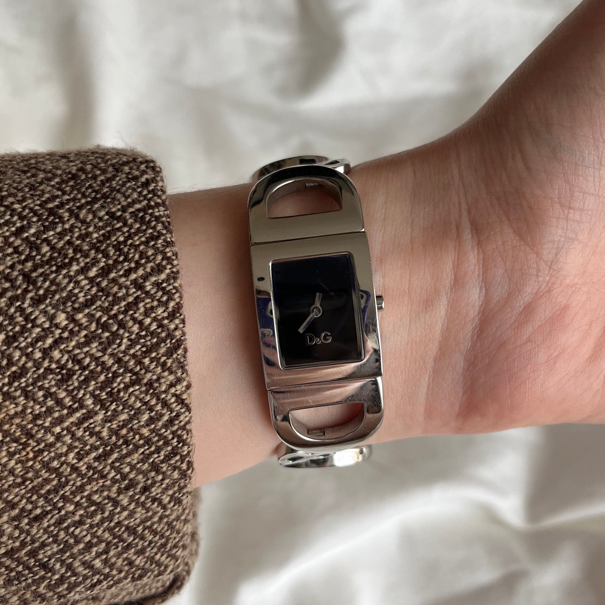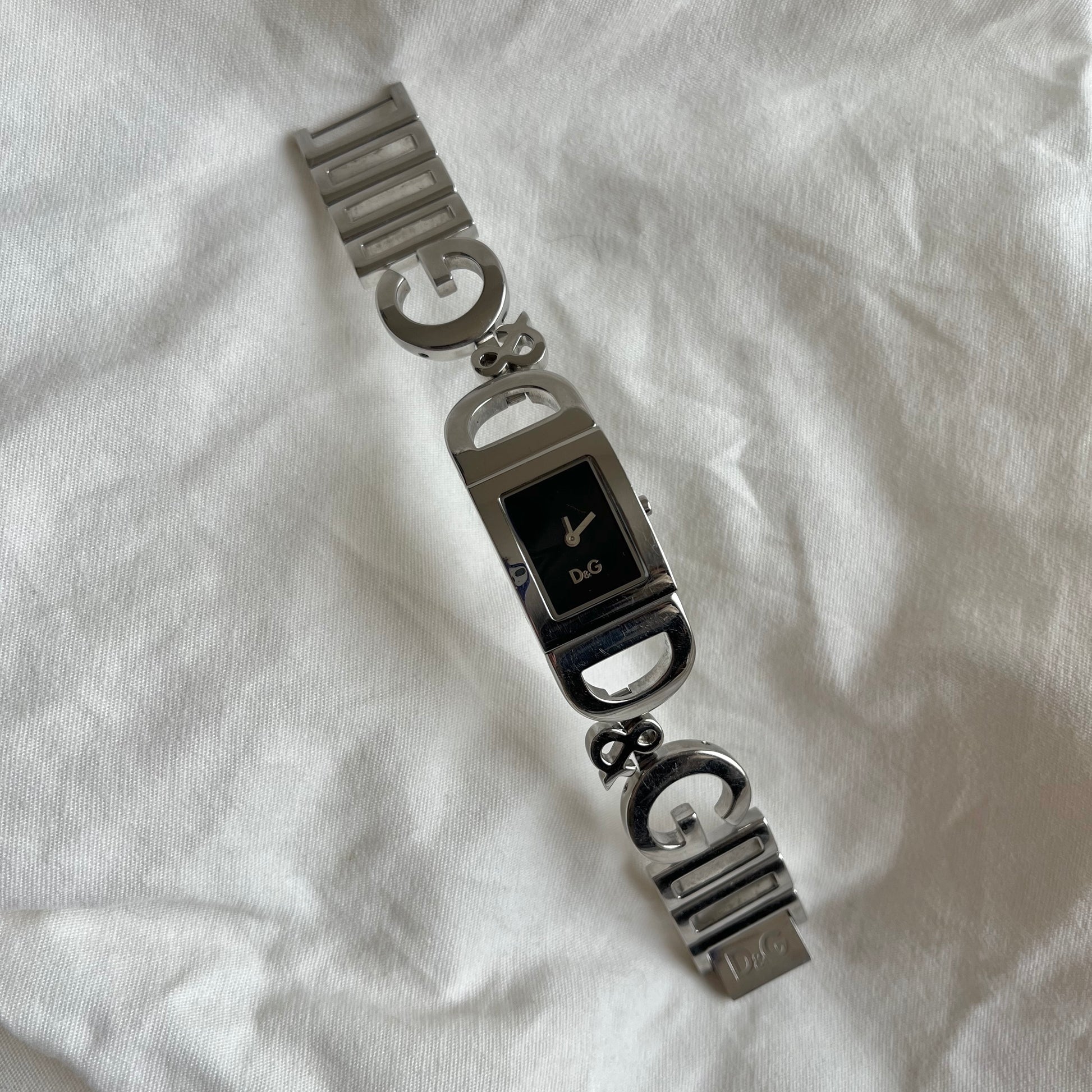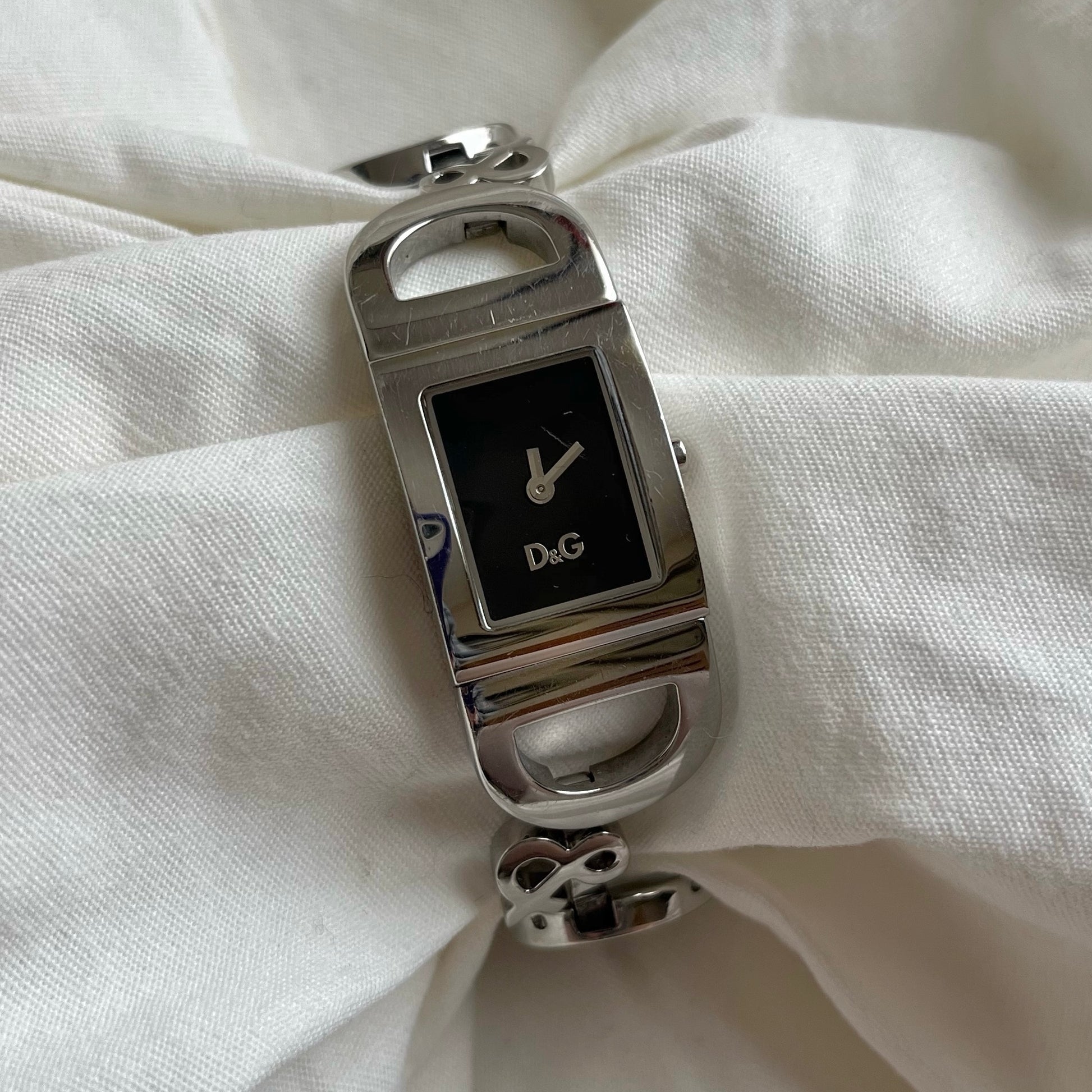 relógio dolce & gabbana funcionando à bateria. feito em aço inox polido, mostrador preto e ponteiros prateados. possui um risquinho no mostrador, vide fotos. no mais, excelente estado, mínimas marcas de uso.
