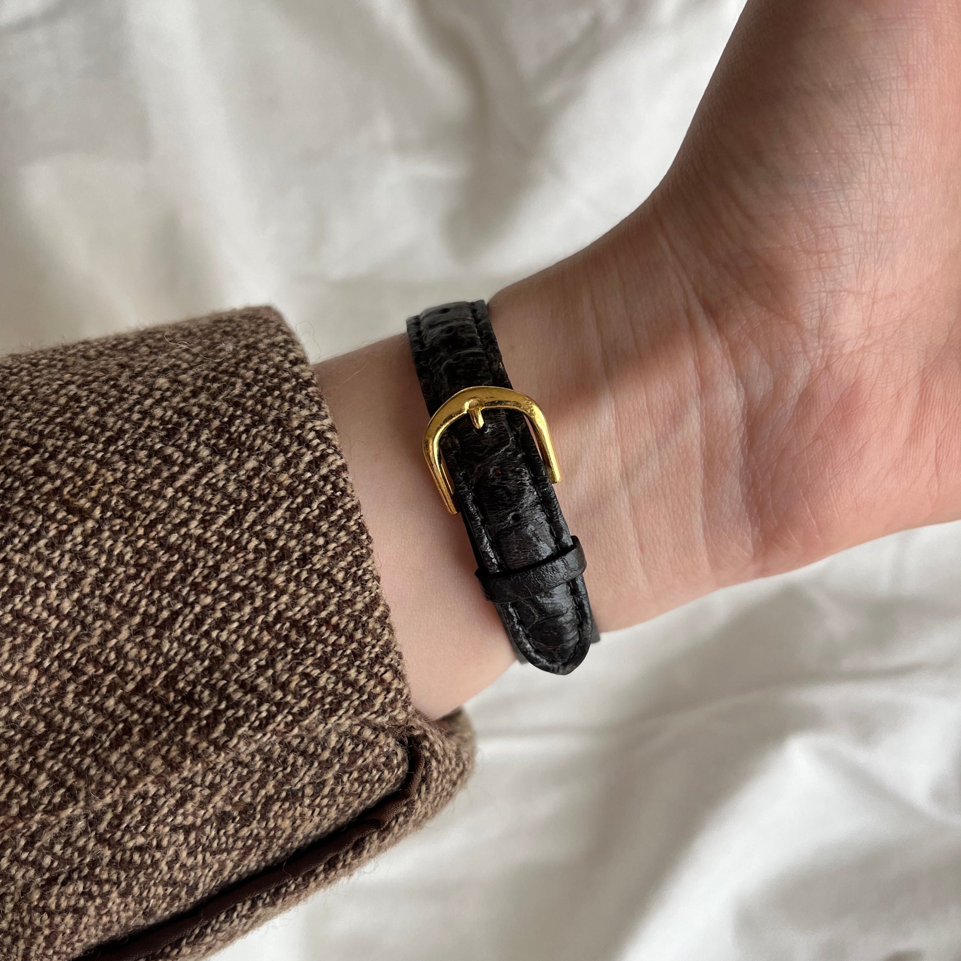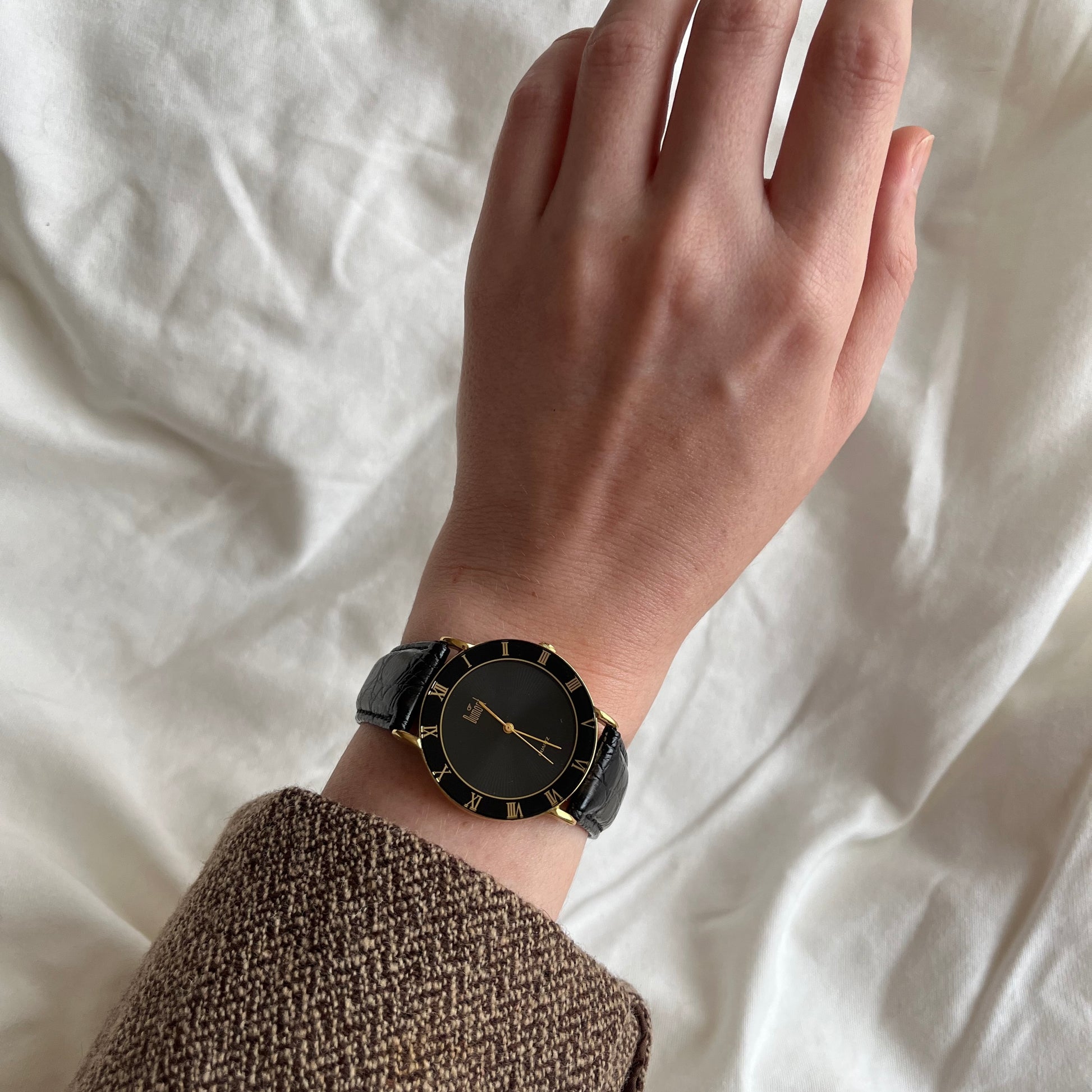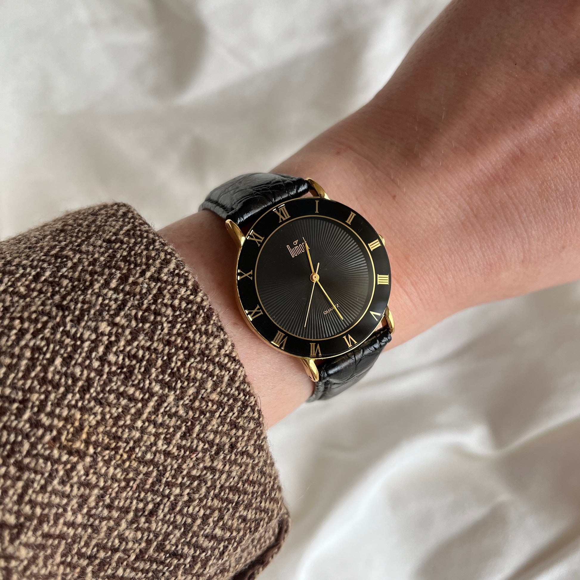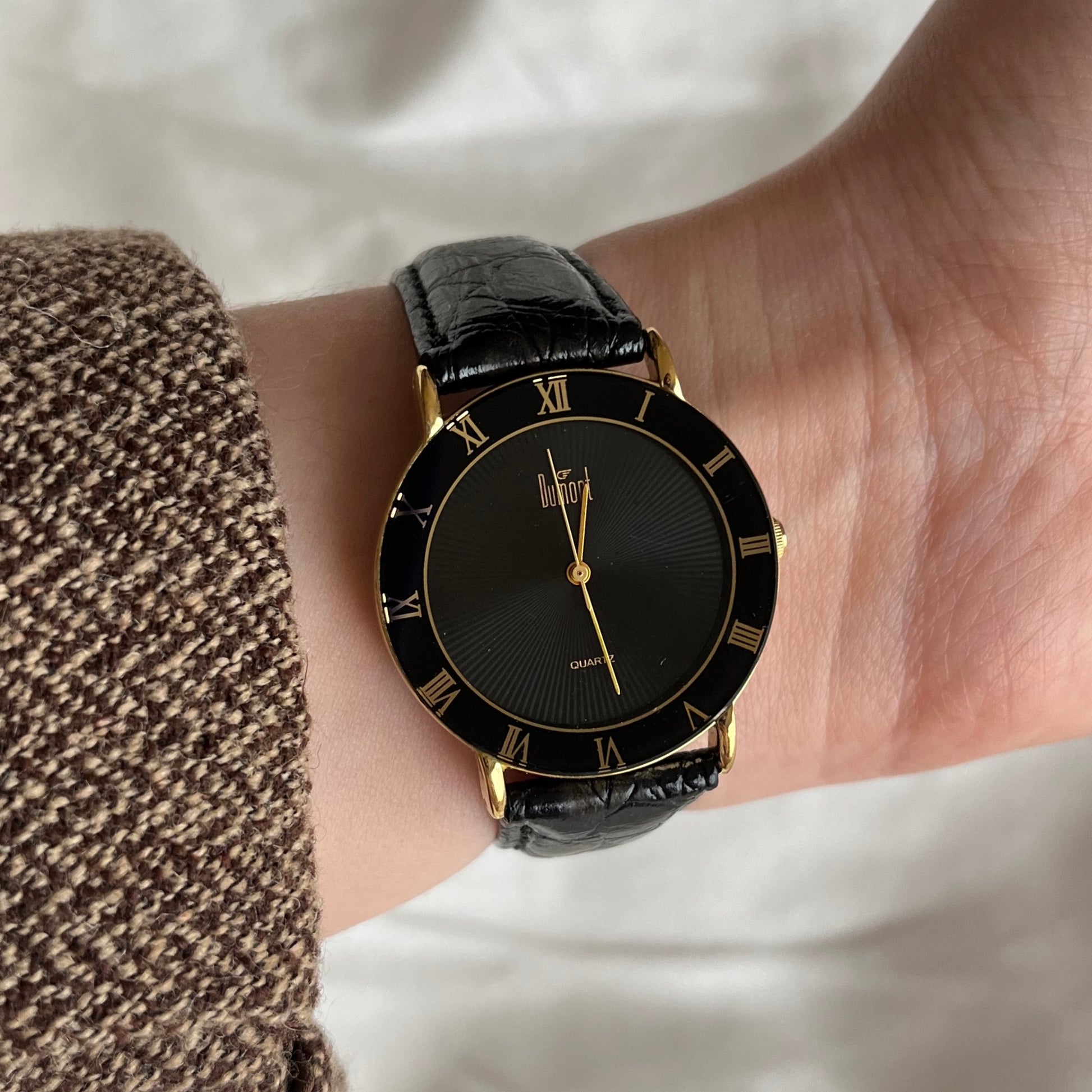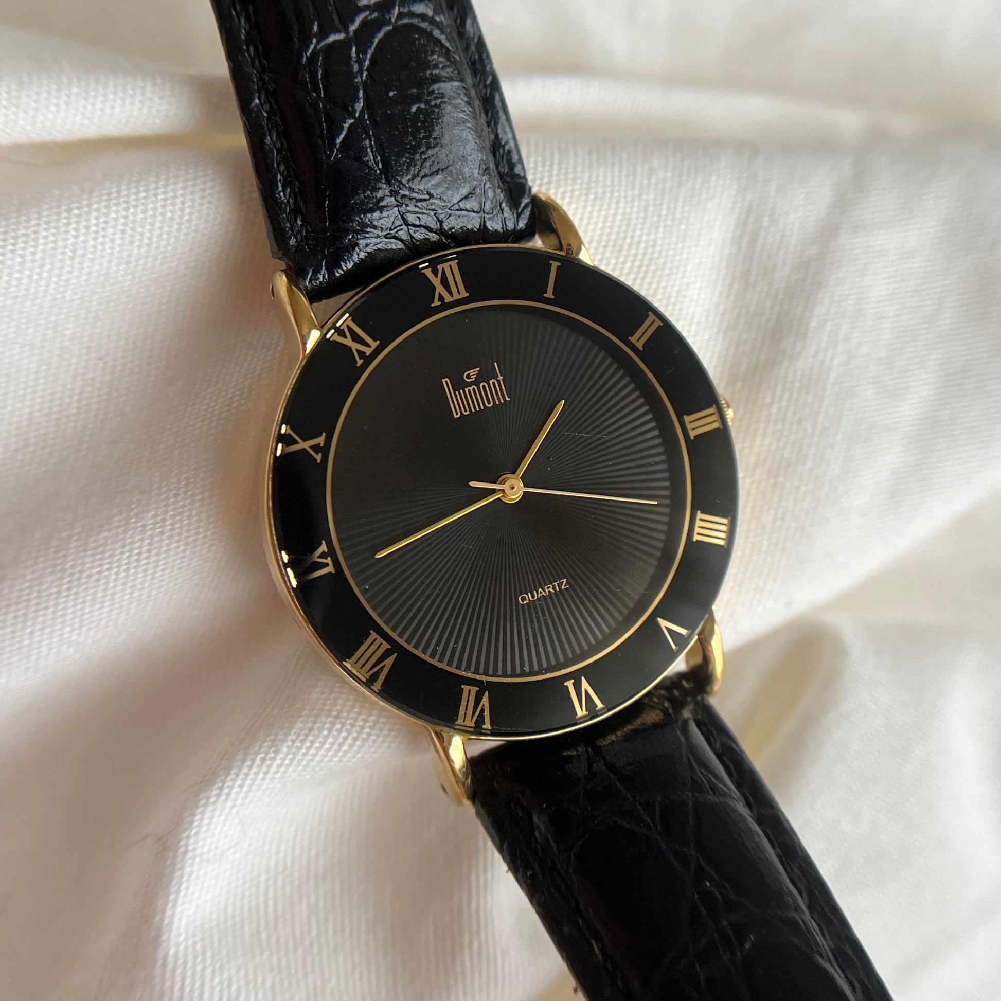 relógio dumont funcionando à bateria. mostrador negro, detalhes em dourado. pulseira de couro com textura. em excelente estado, visor limpo e sem riscos, esmalte e banho dourado íntegro e sem detalhes. pulseira com leves marcas de uso no fecho.