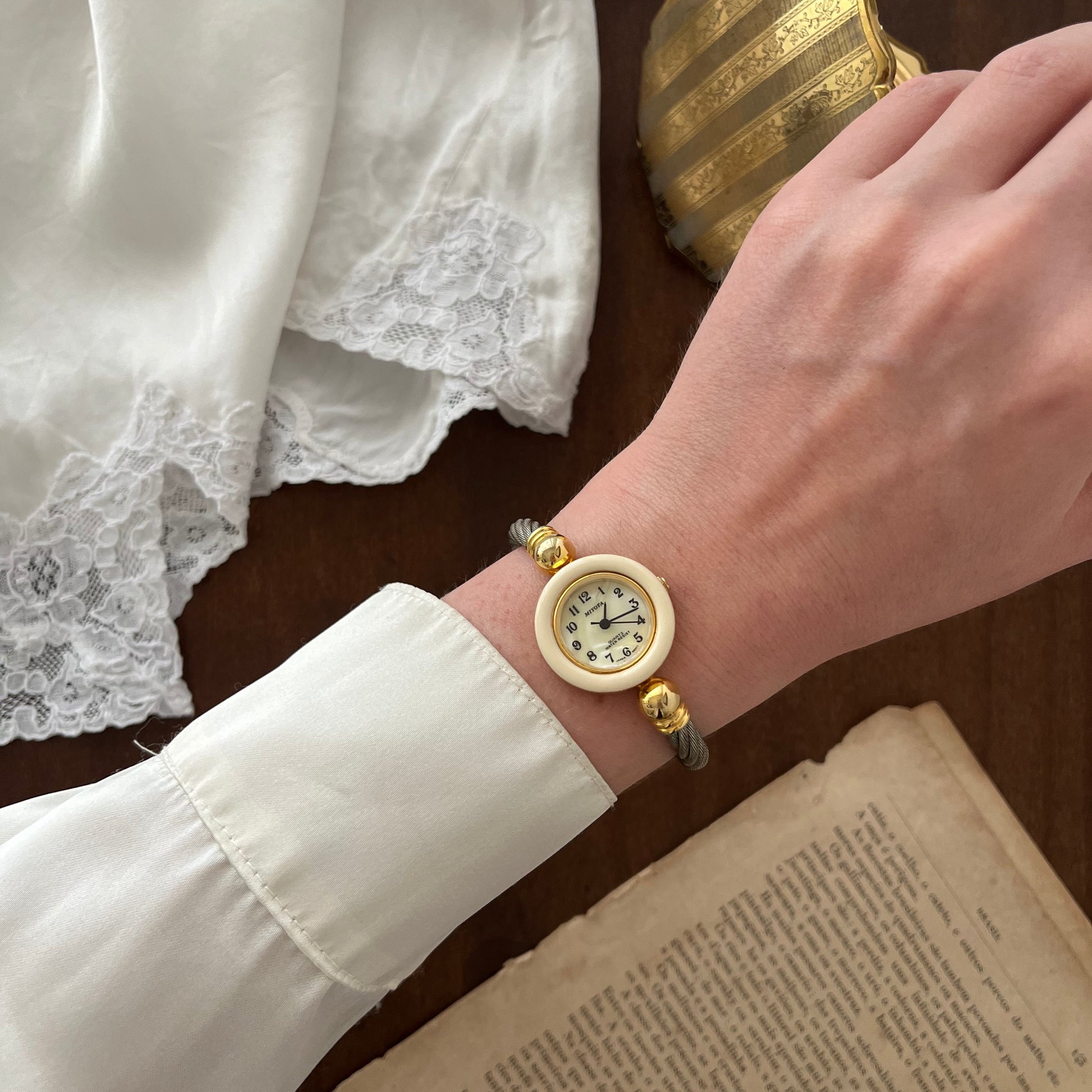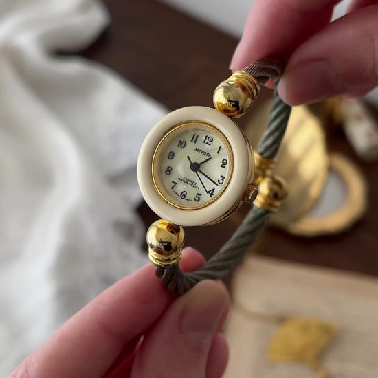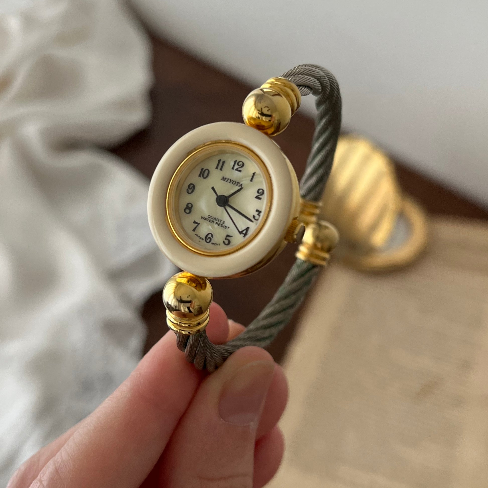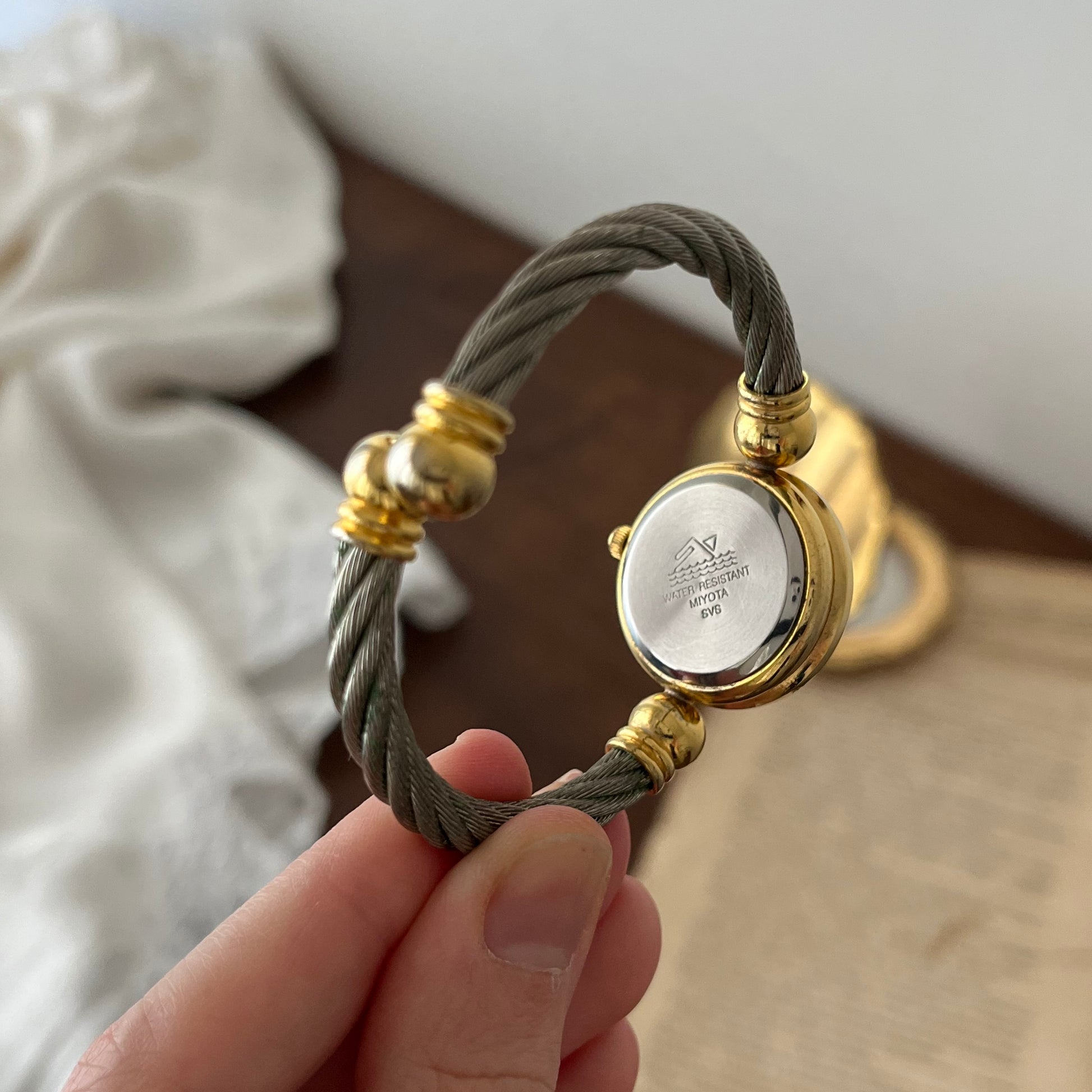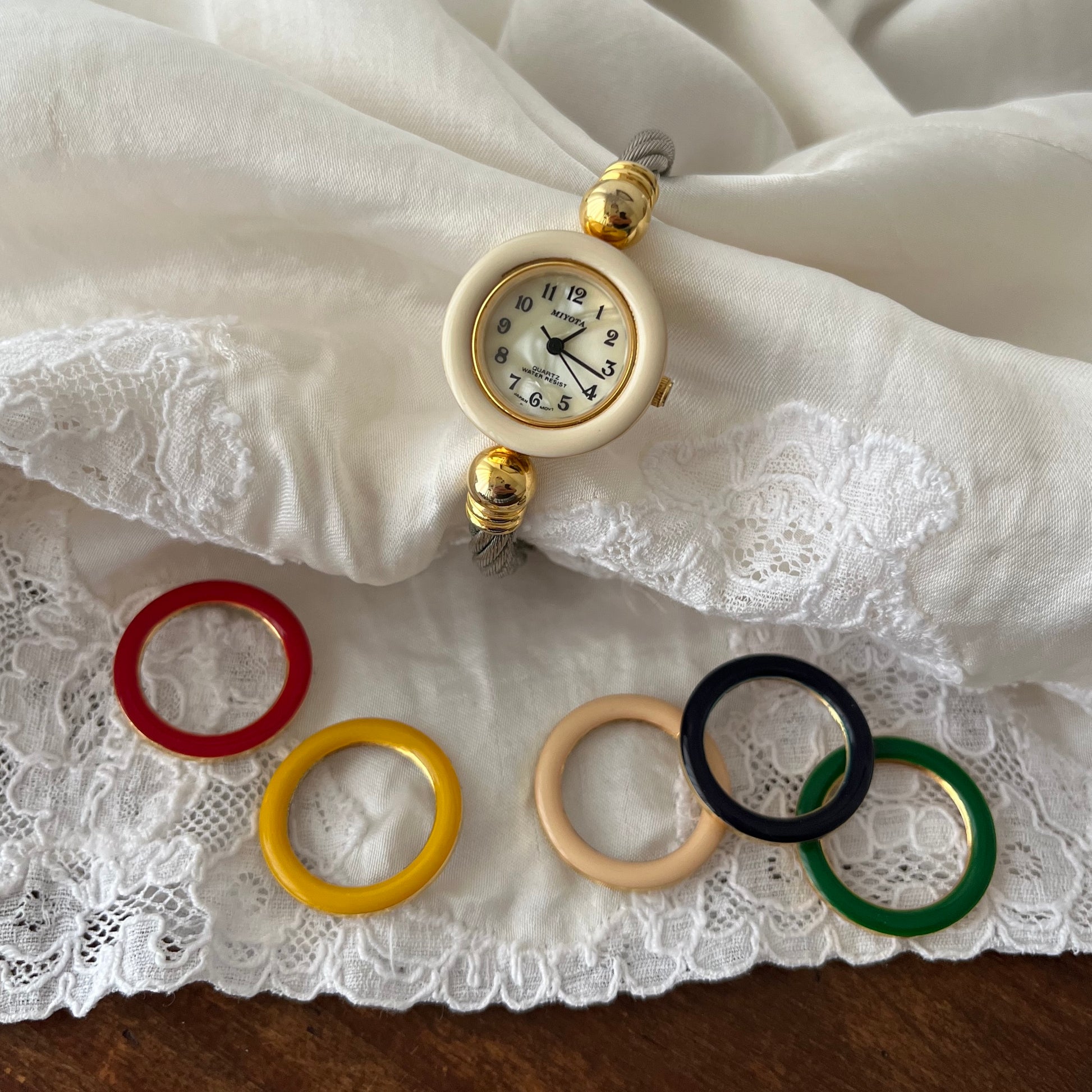 relógio myiota funcionando à bateria. acompanha 6 biseis trocáveis em diversas cores. caixa dourada, pulseira em aço. em excelente estado de conservação.