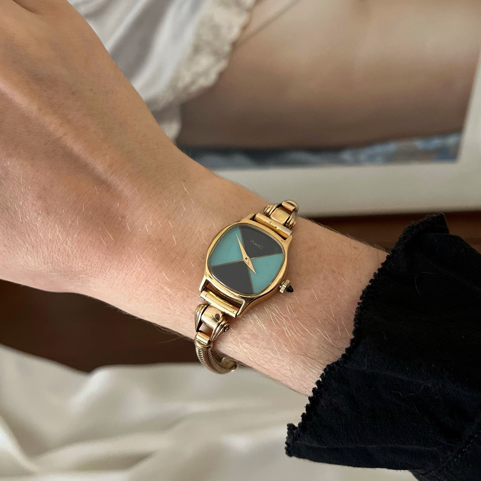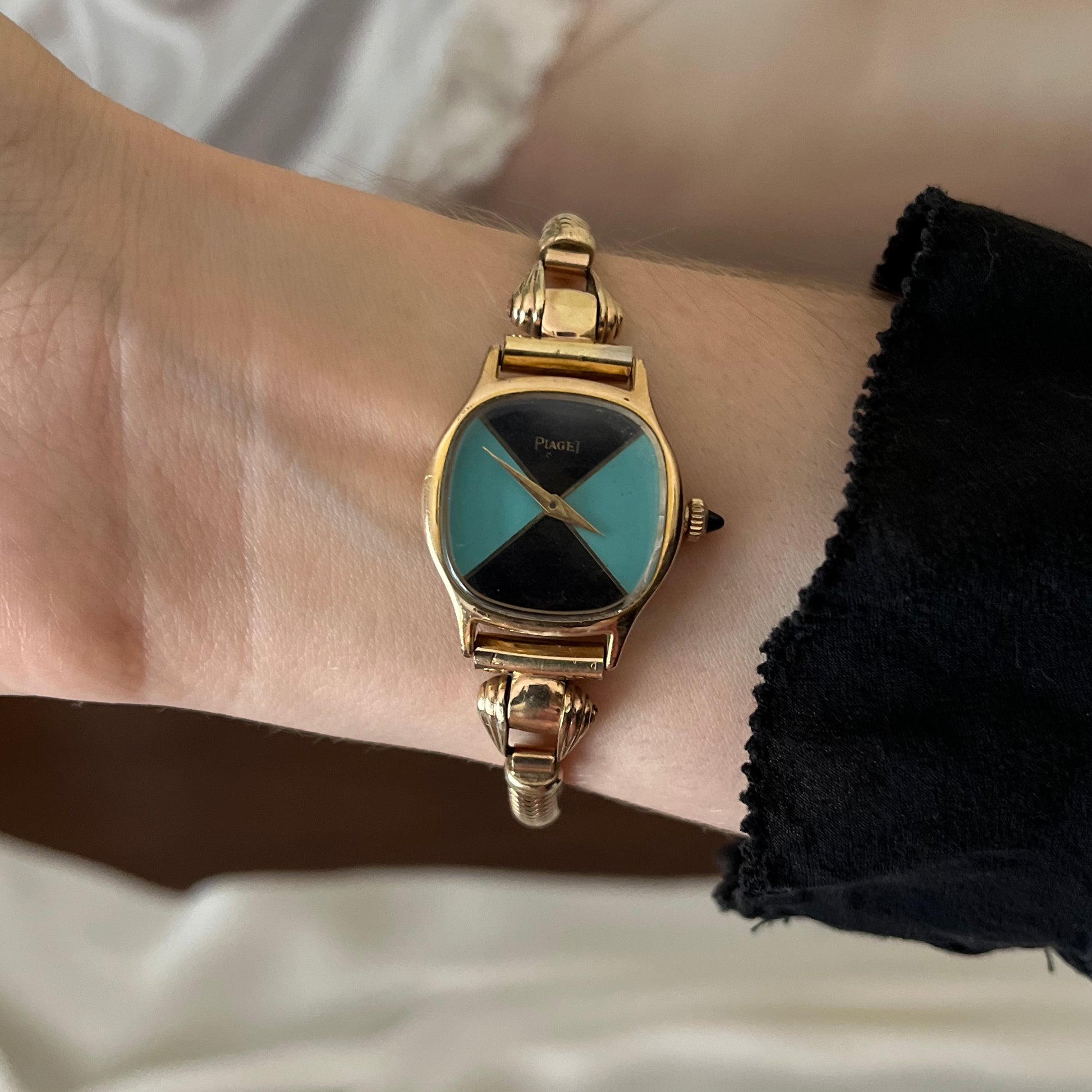 relógio piaget vintage. suíço, maquinário original com movimento manual à corda. funcionando. estimado da década de 1970. belíssimo mostrador com um vibrante tom de azul claro. caixa banhada a ouro 18k. pulseira não é original da peça, feita na Alemanha com 10 microns de ouro. estado geral bom com leves marcas naturais do tempo e uso.