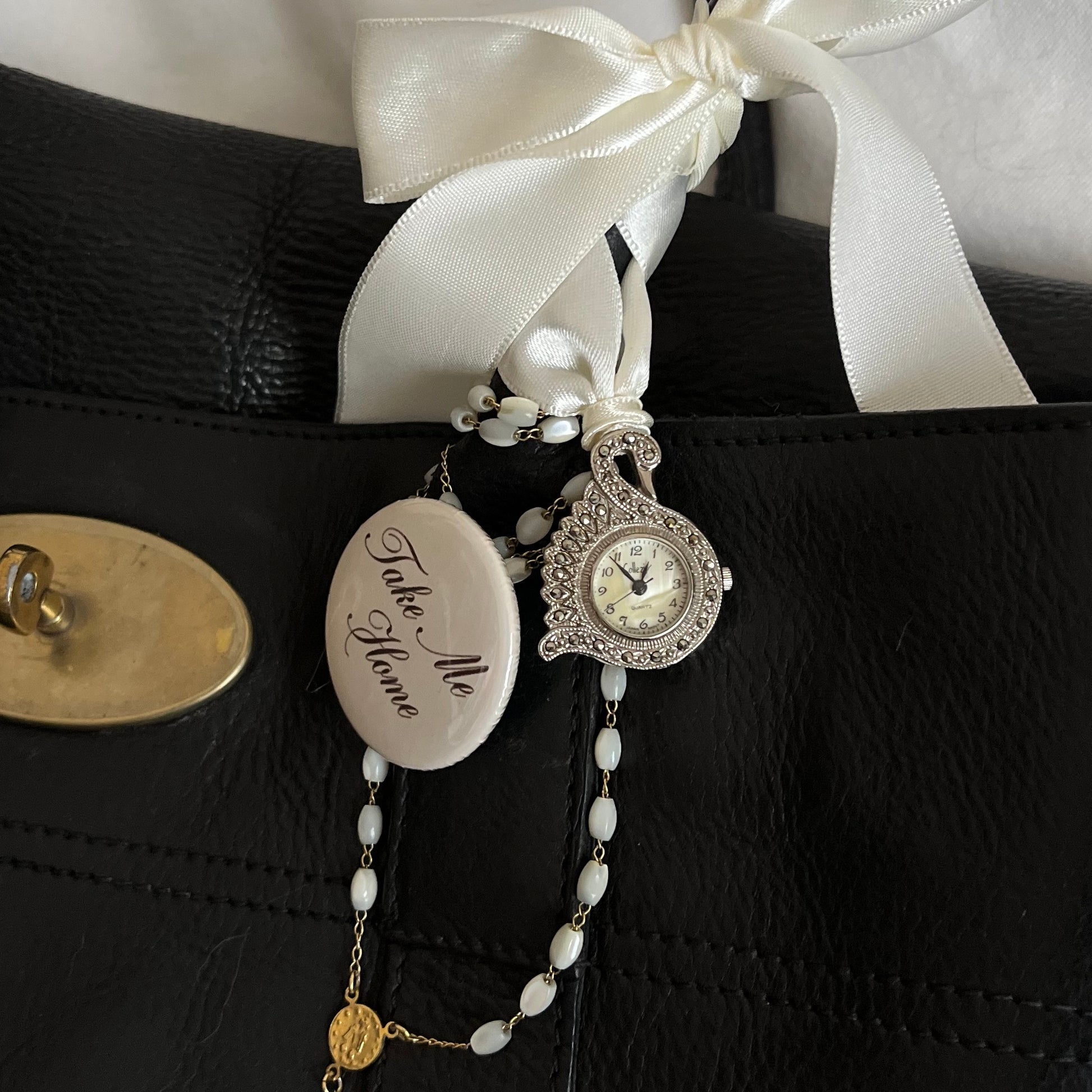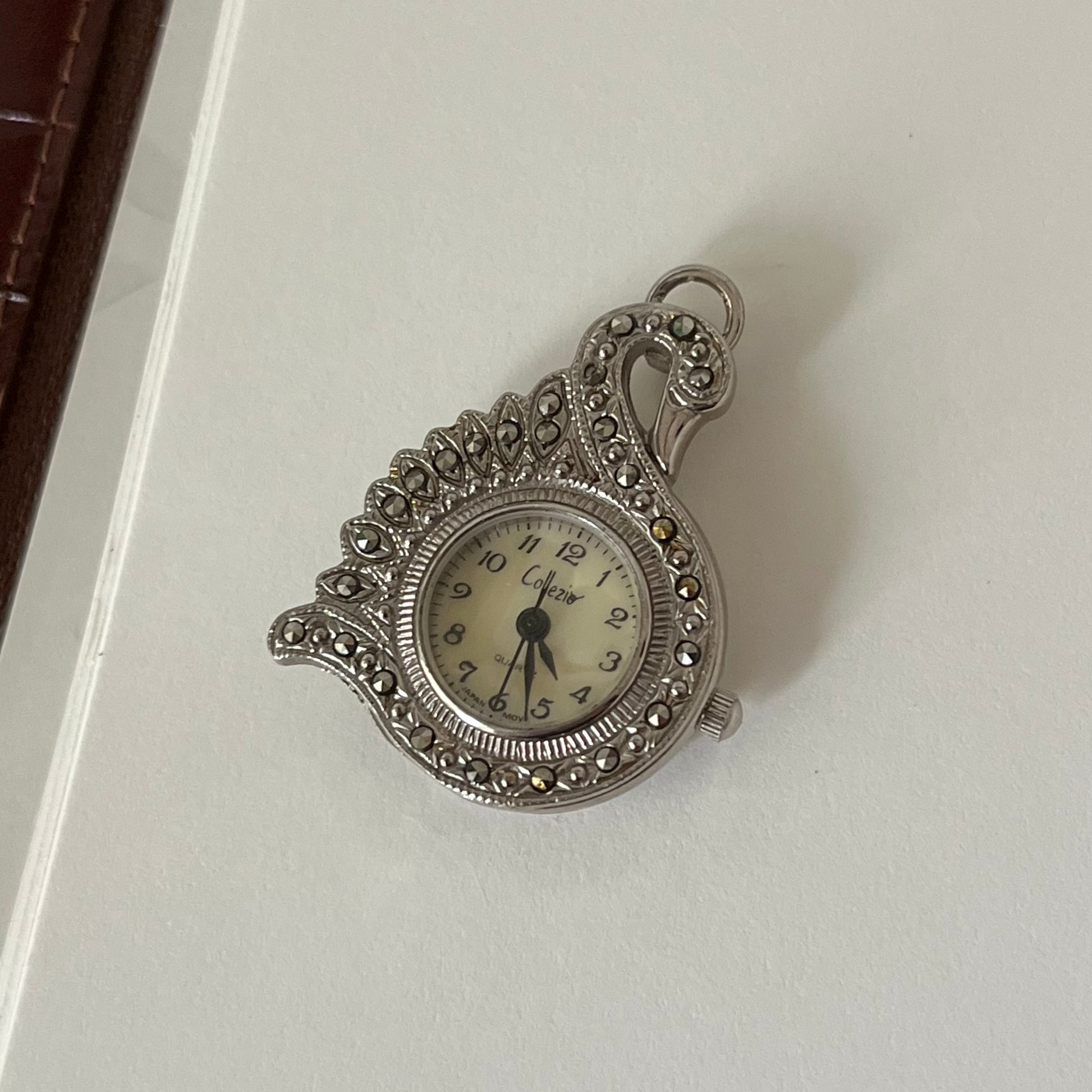 relógio collézio, vintage, funcionando à bateria. em formato de cisne, pode ser usado como pingente em colares, bolsas, chaveiros, etc. incrustado de pequenas pedras marcassitas.