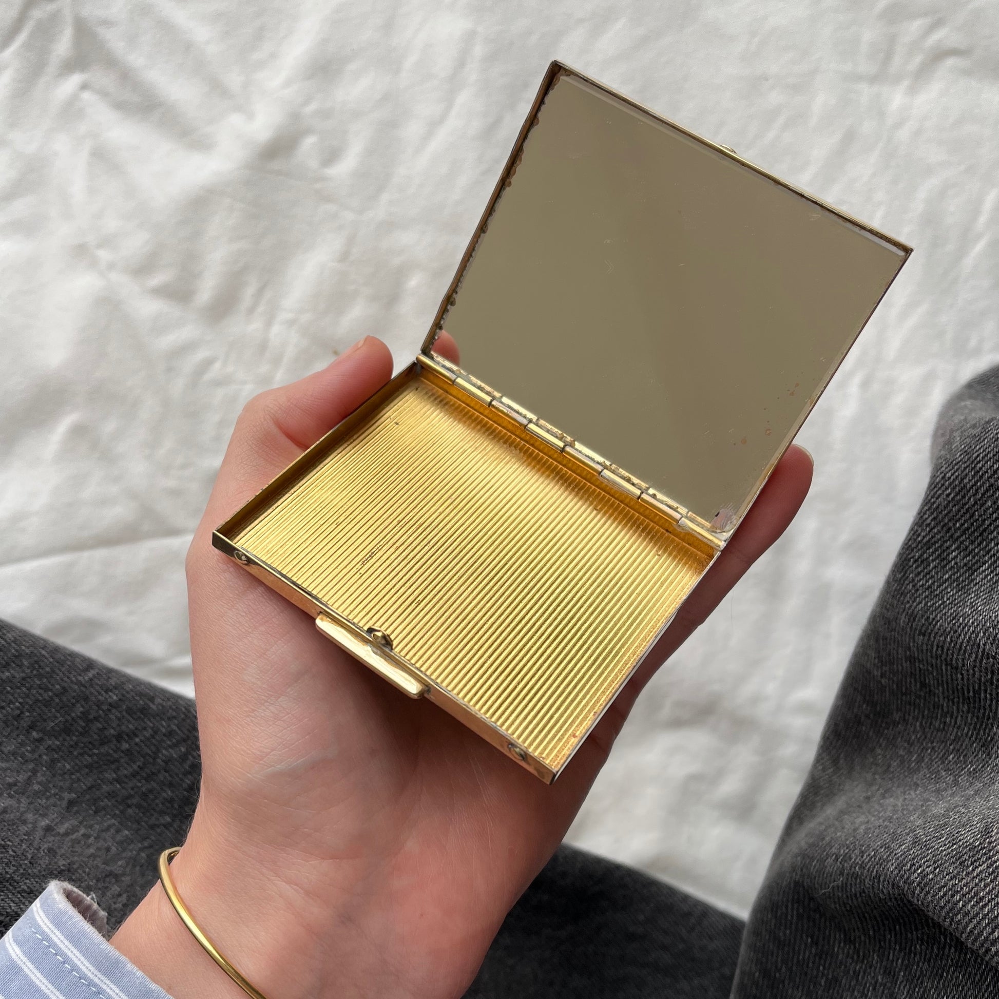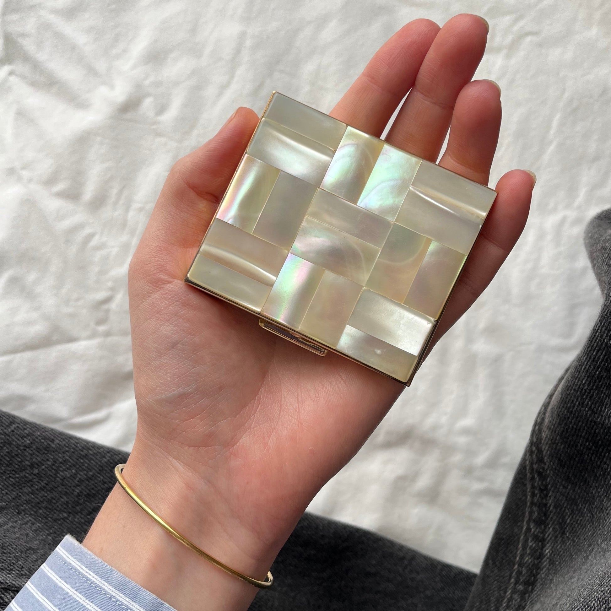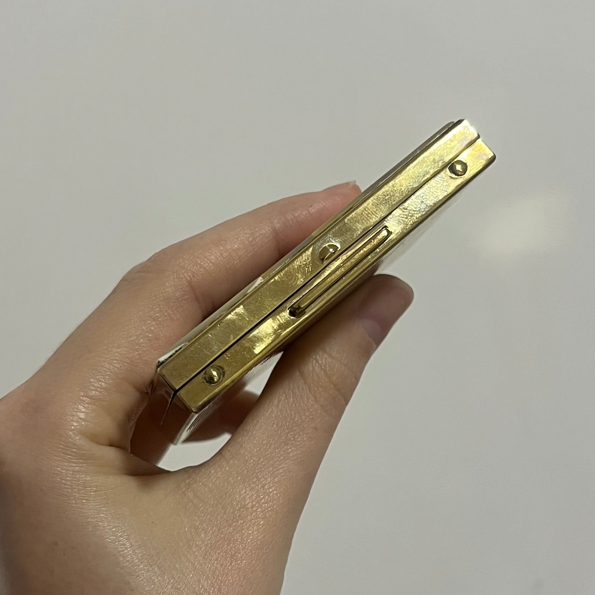pequeno estojo vintage feito em metal dourado com acabamento em madrepérola natural. possui um único compartimento interno e espelho. o espelho possui leves bicadinhos na lateral, nada que afete uso, vide fotos.