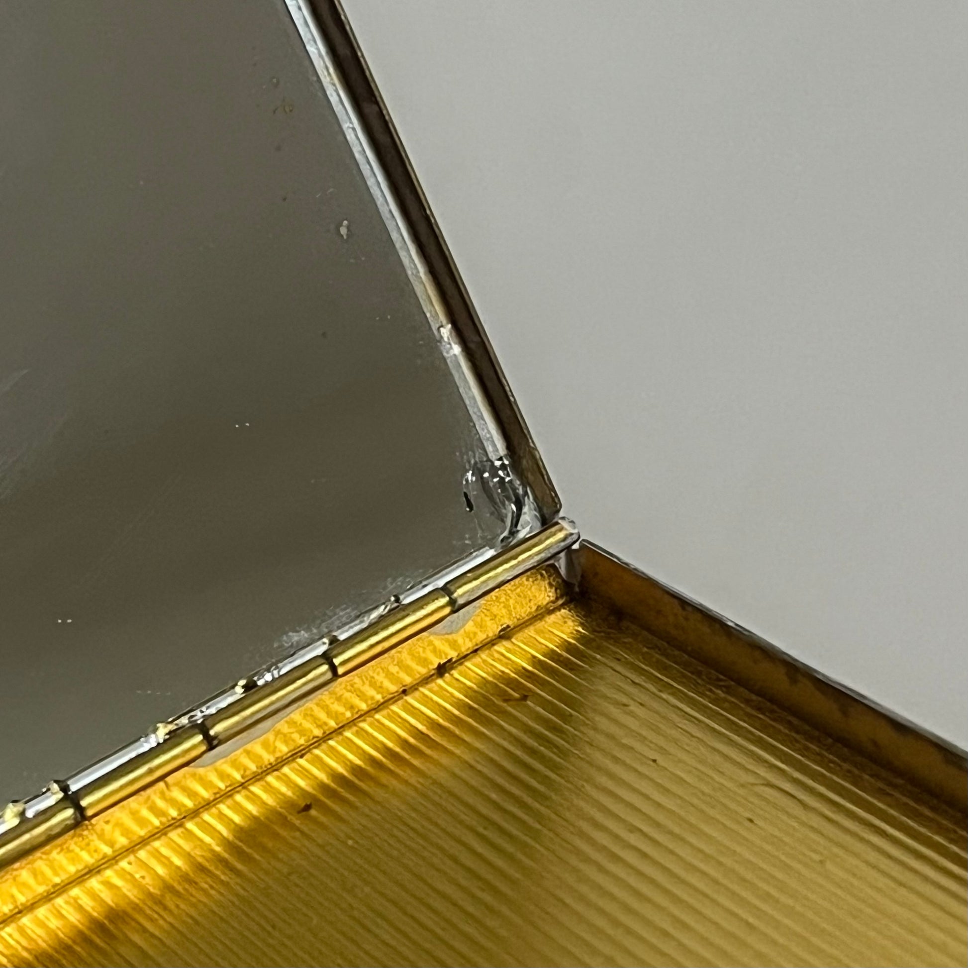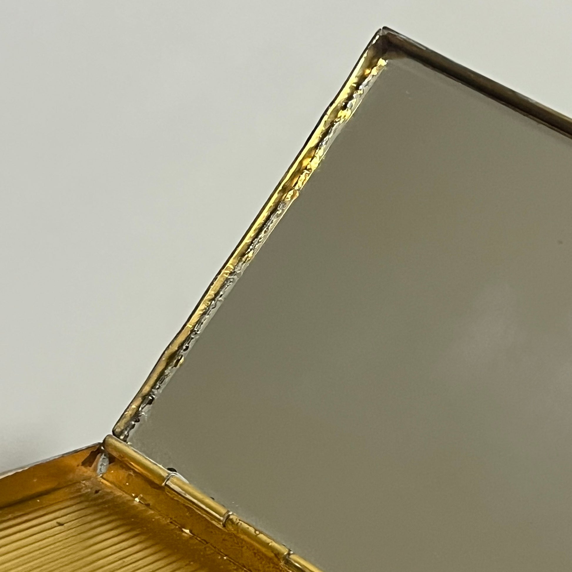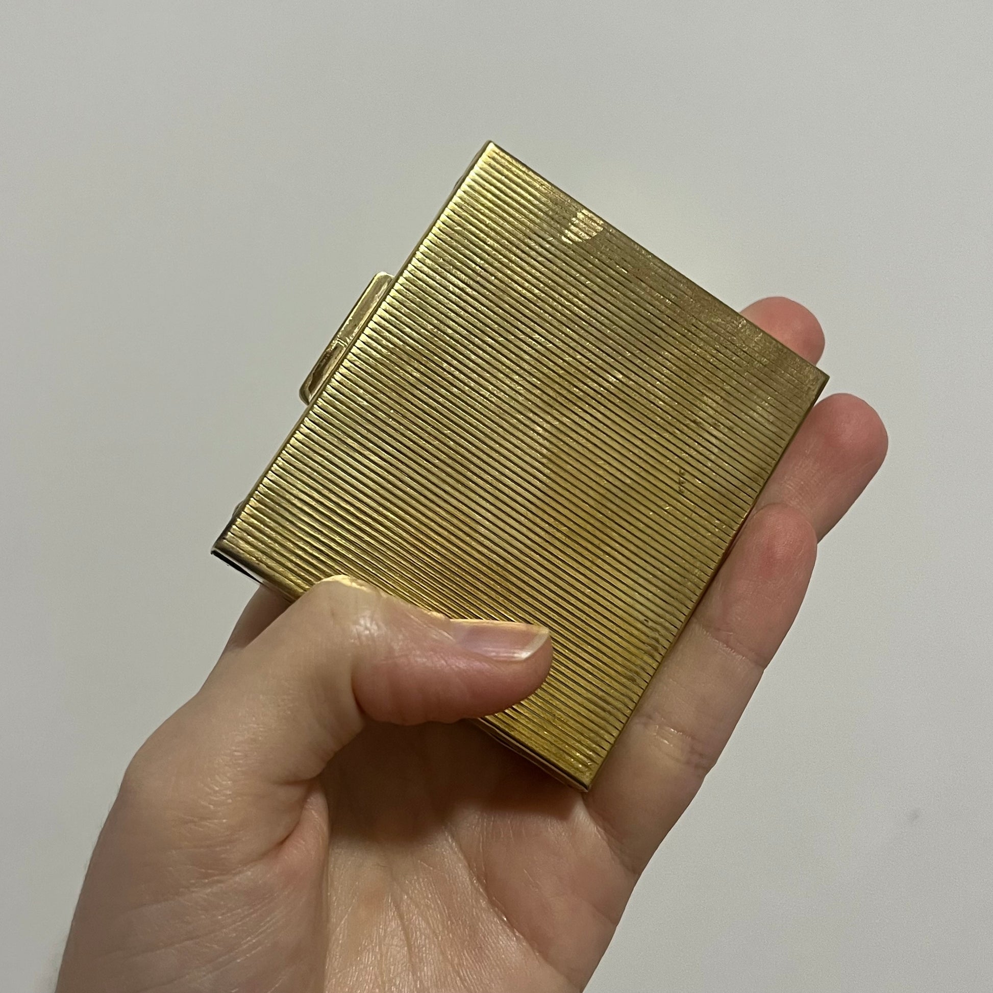 pequeno estojo vintage feito em metal dourado com acabamento em madrepérola natural. possui um único compartimento interno e espelho. o espelho possui leves bicadinhos na lateral, nada que afete uso, vide fotos.